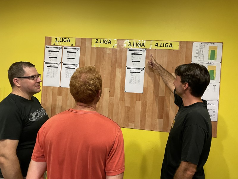 A takto nevěřícně se u nástěnky ,,CTI a HANBY,, dmuli pýchou chlapci z PVC. A nutno dodat, že oprávněně. Za celý večer nepoznali hořkost porážky. Petr Hovorka zažil asi nejpovedenější večer ve své kariéře (bowlingové) a ovládl tabulku jednotlivců. Teď jde o to zůstat nohama na zemi, protože je to kulatý a za 14 dní může ten paleček mířit zase dolů. Ale ten včerejšek se Vám podařil divočáci.